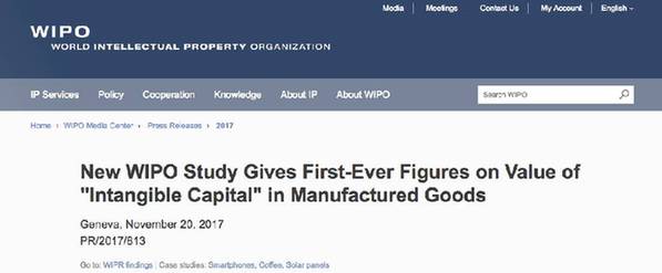 世界知识产权组织发布的这份报告通过对咖啡、太阳能电池板及智能手机这3个行业的分析发现,在2000年至2014年间,知识产权等无形资本份额平均占所销售制成品总值的30.4%,在2014年达到5.9万亿美元。
