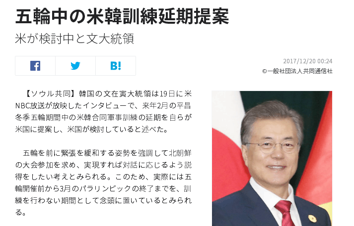 日本共同社12月20日报道说,韩国政府希望朝鲜也能够参加明年2月份的平昌冬奥会,为了缓和冬奥会前夕的半岛局势,文在寅政府希望能够推迟与美方的既定联合军演。