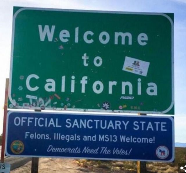 而在美国民间,一些支持特朗普赶走非法移民的美国人则干脆在加州的公路边上立起了这样的标志:“加州欢迎您!官方认证的避难州!欢迎重刑犯、非法移民和黑帮的到来!民主党需要你们的选票!”