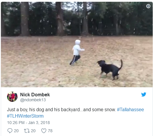 居民多姆贝克(Nick Dombek)说,他5岁的儿子卢卡斯(Lucas)从来没有见过雪,直到今天才看到雪堆积到他们位于塔拉哈西东部的房屋上。他接着说,“我们在外面玩了90多分钟,我怎么让他进屋他都不肯,但我不怪他。”