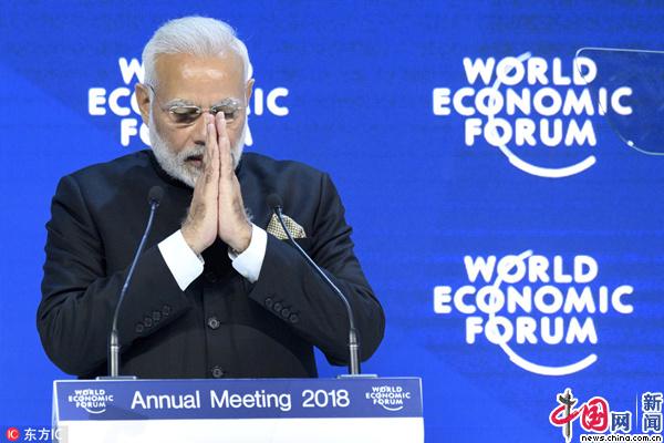 当地时间2018年1月23日,瑞士达沃斯,世界经济论坛第48届年会在达沃斯开幕,印度总理莫迪出席,并在开幕式上发表演讲。(Laurent Gillieron/东方IC)