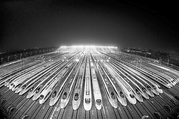 春运前夕,高铁列车在武汉车站排队等待维护。