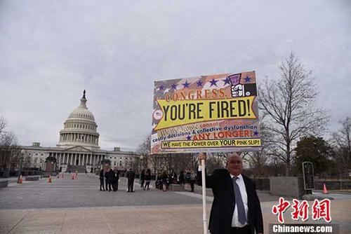 资料图:当地时间1月22日,美国人戴维·迪普斯基(David Dypsky)在美国国会前举牌抗议政府停摆。 中新社记者 邓敏 摄