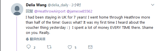 网友Delia Wang:我在英国生活了7年,回家的飞机多半是从希斯罗出发的!猜猜我要说什么?我昨天才第一次听说,呵呵。我在免税店花了很多钱!每次!真的!真为你们感到羞耻!