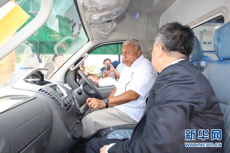 斐济总理姆拜尼马拉马(白衣者)试驾中国援助汽车。新华网记者张永兴 摄