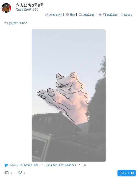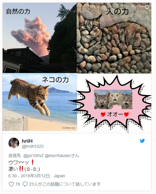 日本网友纷纷惊叹,火山此次喷发的烟尘形状像极了一只猫,“依稀可辨猫的脸和跳跃的前爪,简直完美!自然的力量不可小觑啊!”