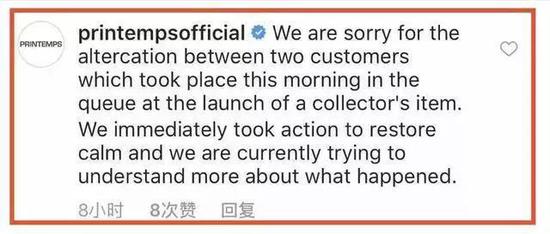 而春天百货发布在其官方Instagram上的声明更是毫无歉意:我们很抱歉,今天上午在一个新品发布的队伍中,两名顾客发生了争吵。我们立刻采取了行动恢复了平静,我们目前正在了解更多关于事件的具体细节。