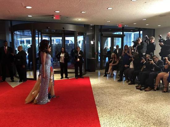 晚宴开始一个多小时,酒店门口就会车水马龙。门厅里人头攒动,有名气的来宾进门就会被镁光灯轰炸,五颜六色标志的话筒也随即伸到嘴边。他们逗留的时间可以长一点。