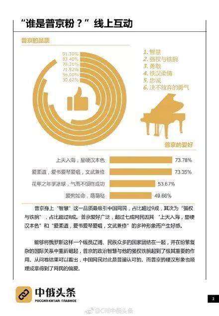 调查显示,截至目前,91.3%的网民认为,普京最吸引人的品质为“智慧”,83.4%欣赏他“决不放弃的韧性”,78.21%推崇他的“勇敢”。