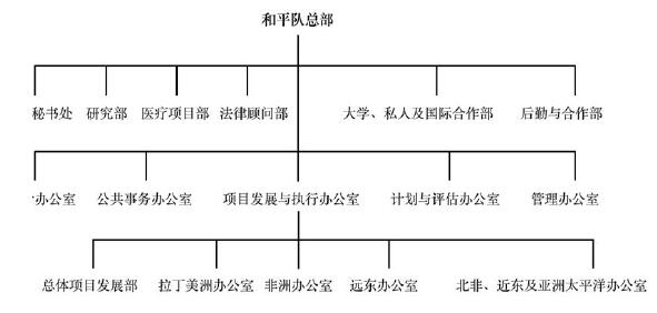 “和平队”是一个非政治组织,总部设于美国华盛顿。在具体运作过程中受美国总统办公厅的直接管辖,上级机构为美国联邦政府。首任行政首长兼队长为萨金特•施莱弗。1963年,人员方面得到充实,部门体系的构建也逐步完善。“和平队”主要机构设置如下图所示。