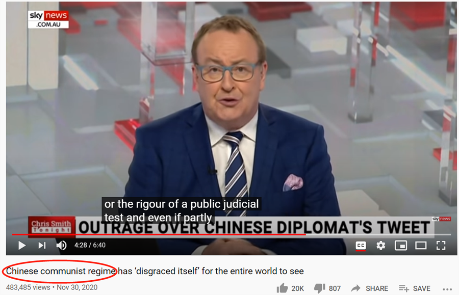 澳大利亚天空电视台主持人克里斯•史密斯为了替澳军暴行辩护,做了一个题为“Chinese communist regime has ‘disgraced itself’ for the entire world to see”(中国共产党政权在全世界面前“颜面扫地”)的电视节目。