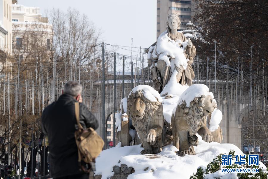 1月10日,一名男子在西班牙马德里市中心拍摄丰收女神雕塑。新华社记者 孟鼎博 摄