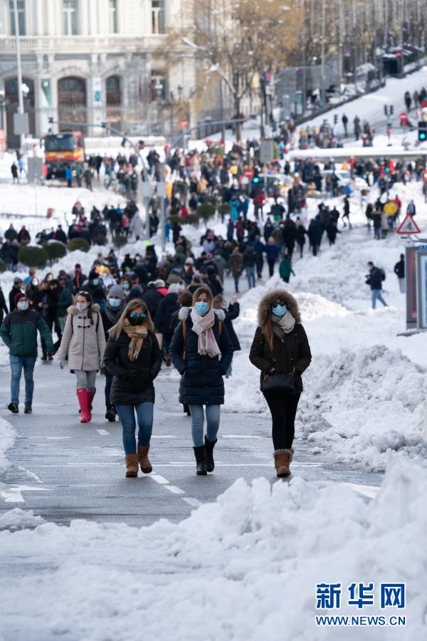 1月10日,人们走在雪后的西班牙马德里街头。新华社记者 孟鼎博 摄