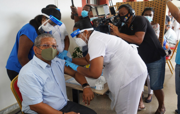 当地时间1月10日,塞舌尔总统办公室发布消息,包括总统拉姆卡拉旺在内的塞舌尔主要政治领导人和多名卫生工作者,相继接种了中国国药集团(SinoPharm)生产的新冠肺炎疫苗。塞舌尔卫生部发布消息说,该国将陆续展开新冠疫苗接种工作,塞舌尔也成为非洲地区首个开展大规模新冠疫苗接种的国家。(总台记者 马培敏)