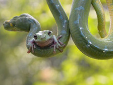大胆树蛙趴蟒蛇身上“荡秋千”