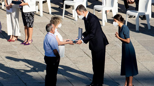 西班牙15日在马德里举行国家纪念仪式,追思和哀悼新冠疫情病亡者,并向在疫情中殉职的医务人员家属授予勋章。